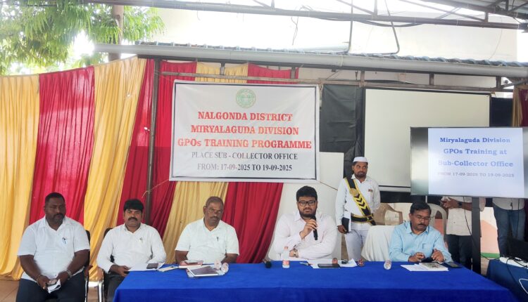 మిర్యాలగూడ ప్రజాలహరి … , మిర్యాలగూడ డివిజన్ పరిధిలో కొత్తగా నియమించబడిన జీపీఓలకు మూడు (03) రోజుల (17.09.2025 నుండి 19.09.2025) వరకు శిక్షణా కార్యక్రమాన్ని సబ్-కలెక్టర్ కార్యాలయం, మిర్యాలగూడ నందు ఏర్పాటు చేయడం జరిగింది.
