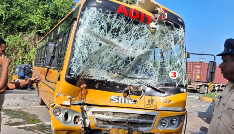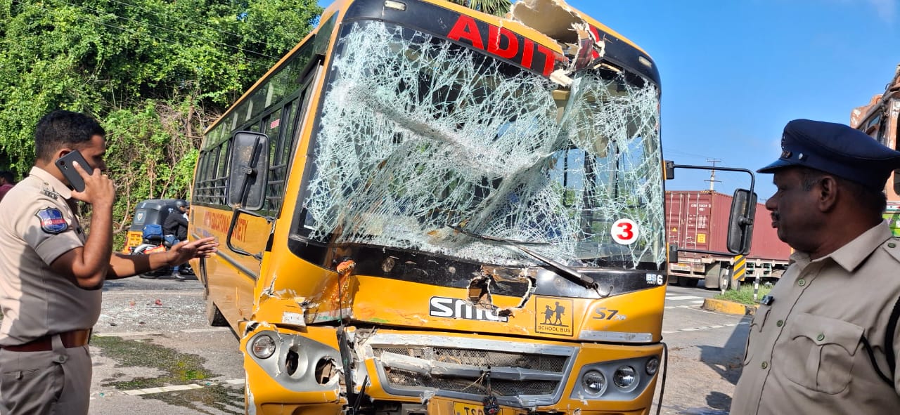 స్కూల్ బస్సును ఢీ కొట్టిన లారీలు